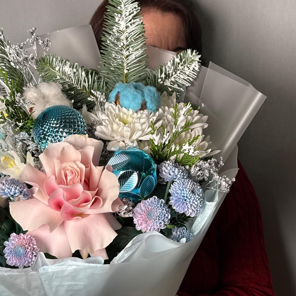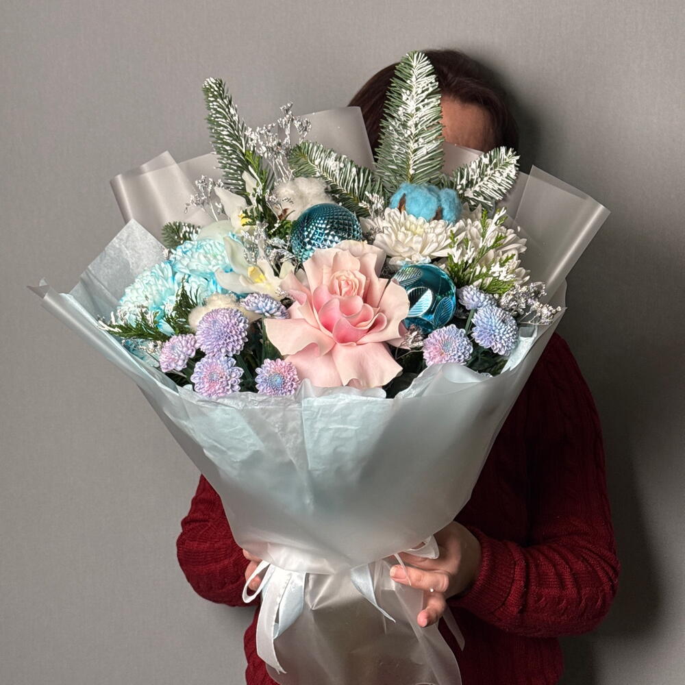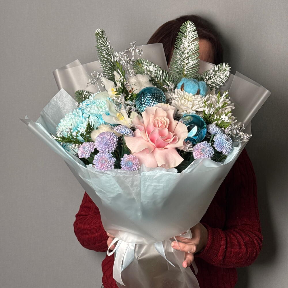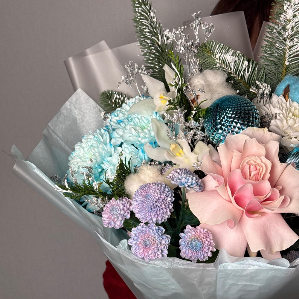 Состав Лимониум - 2 шт. Хлопок - 3 шт. Роза Эквадор - 1 шт. Лента атласная - 2 шт. Сантини - 2 шт. Упаковка дизайнерская - 2 шт. Нобилис - 1 шт. Елочные игрушки - 2 шт. Цимбидиум белый - 2 шт. хризантем - 2 шт.