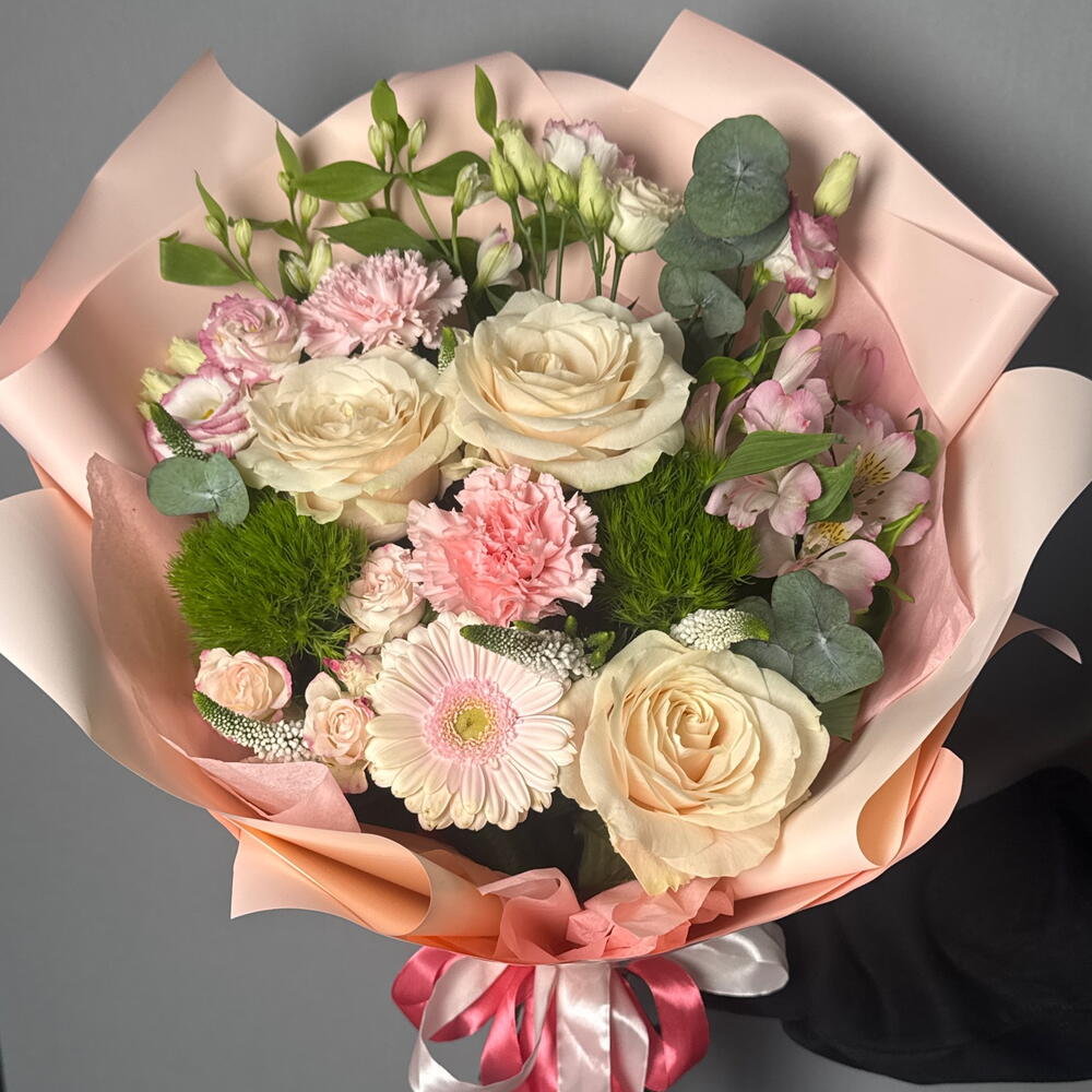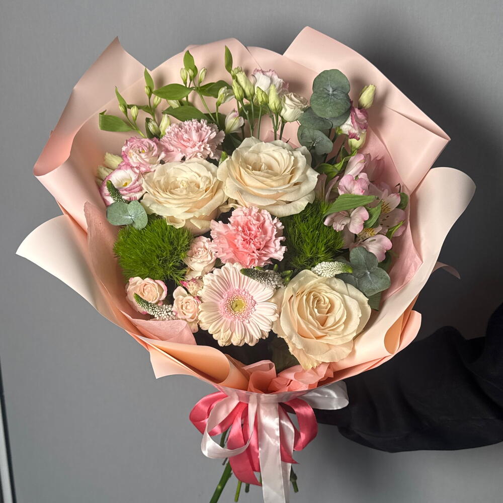 Букет большой сборный с розами, альстромерией, диантусами и эвкалиптом