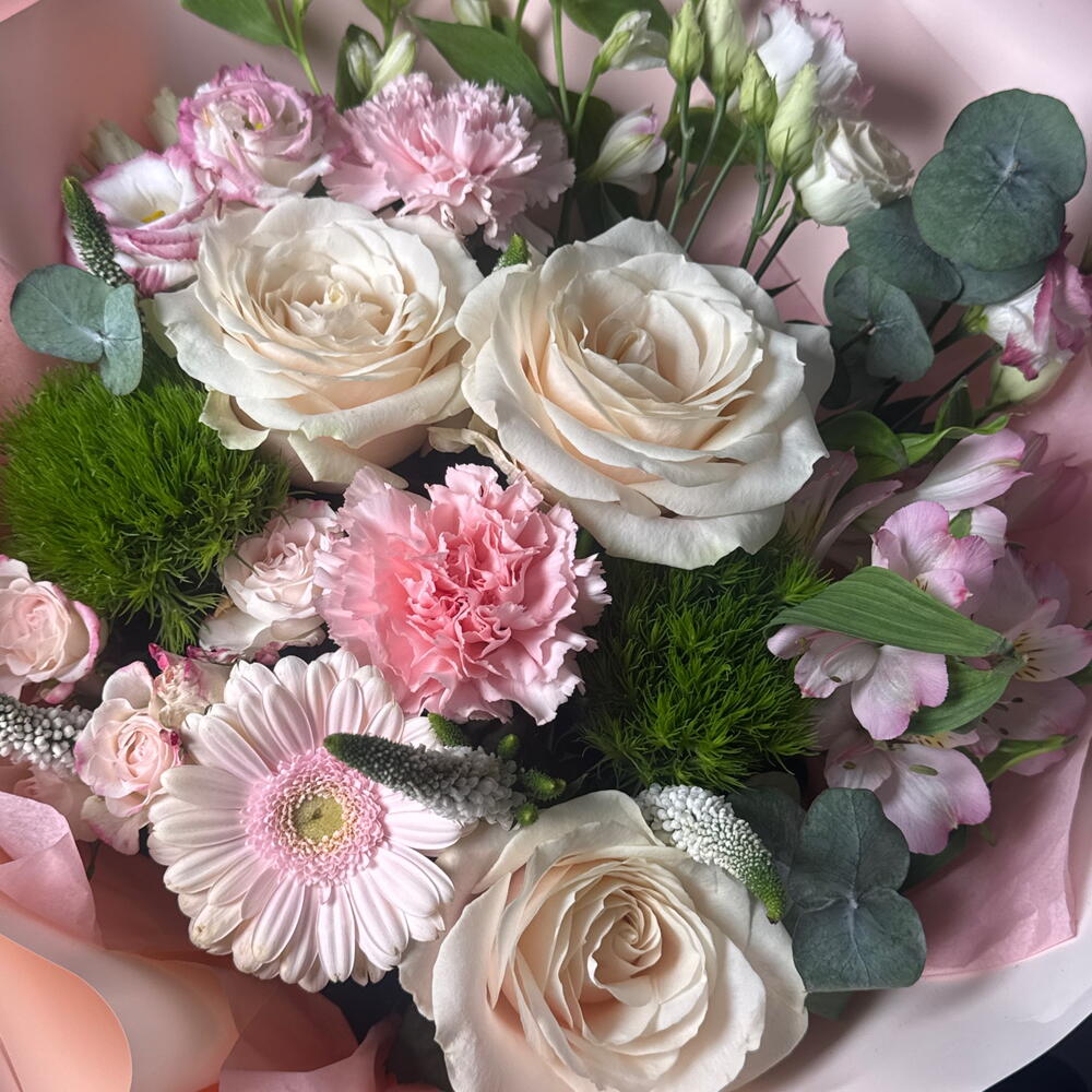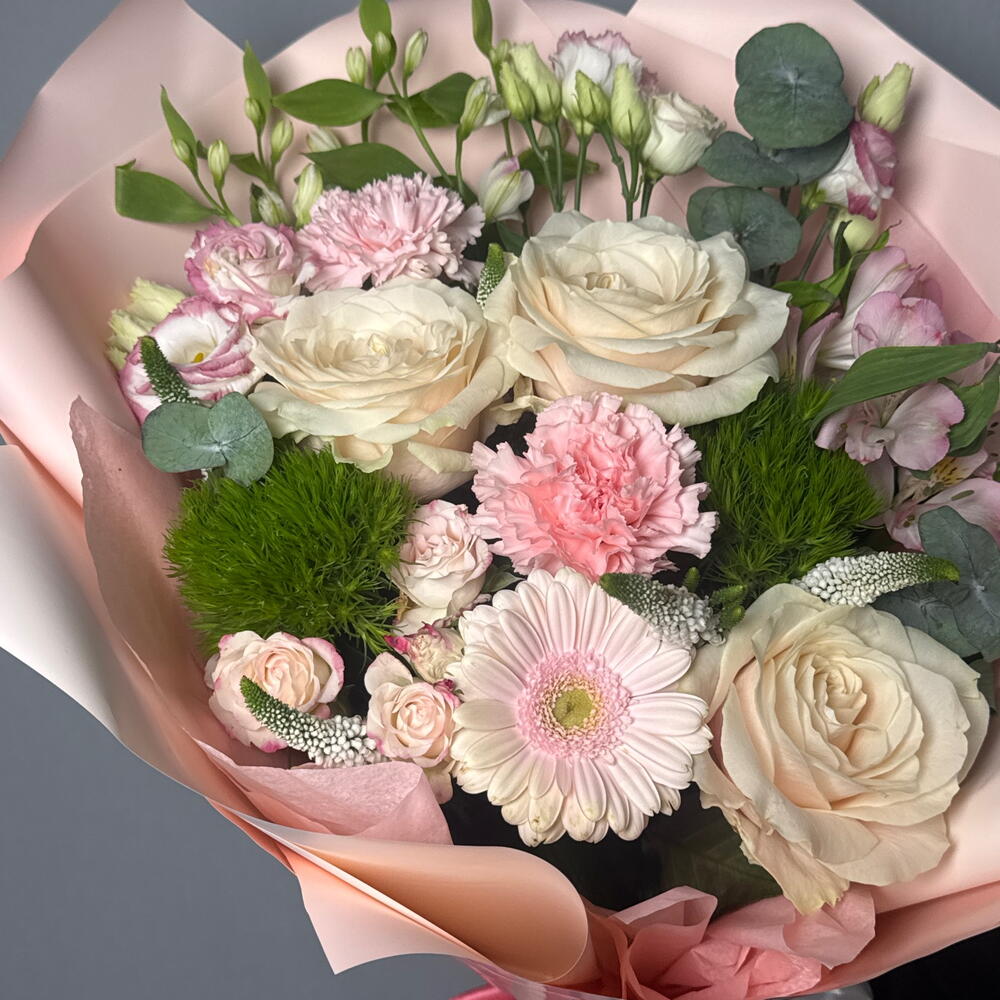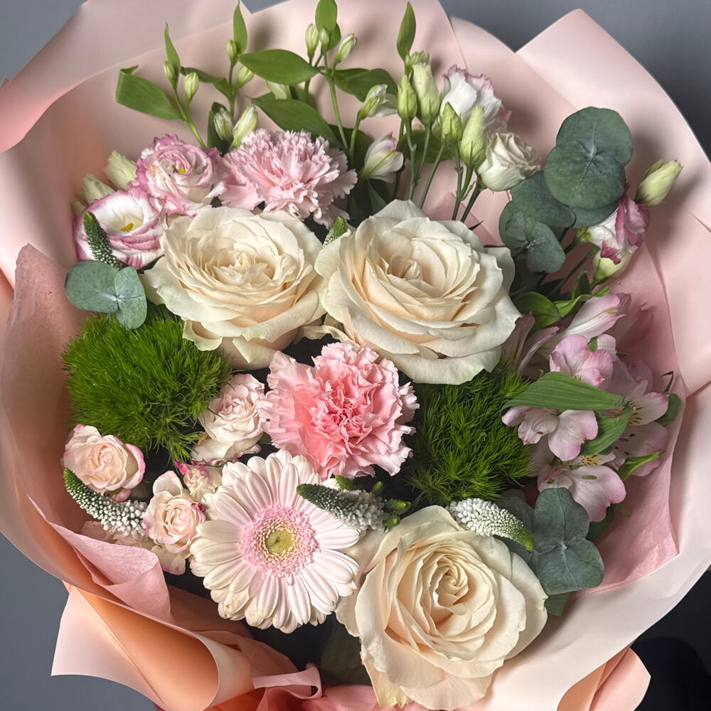 Состав Альстромерия - 2 шт. Вероника - 3 шт. Роза кустовая - 1 шт. Эустома - 2 шт. Диантус - 4 шт. Эвкалипт Цинерея - 1 шт. герьер - 1 шт. дорчестер - 3 шт.