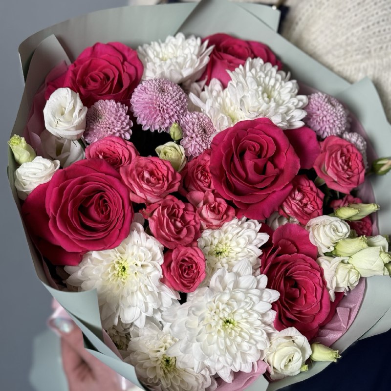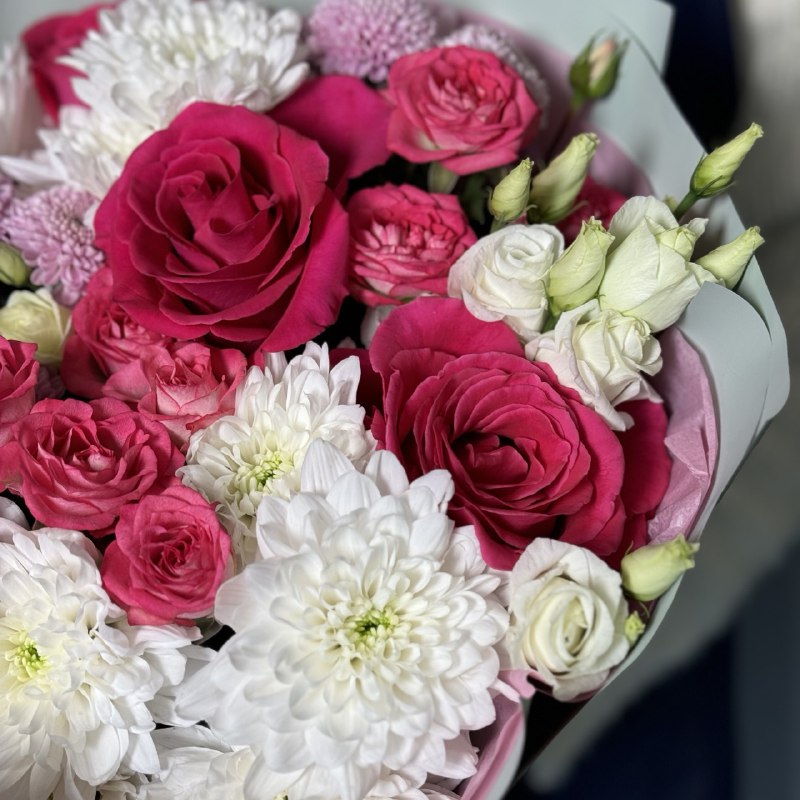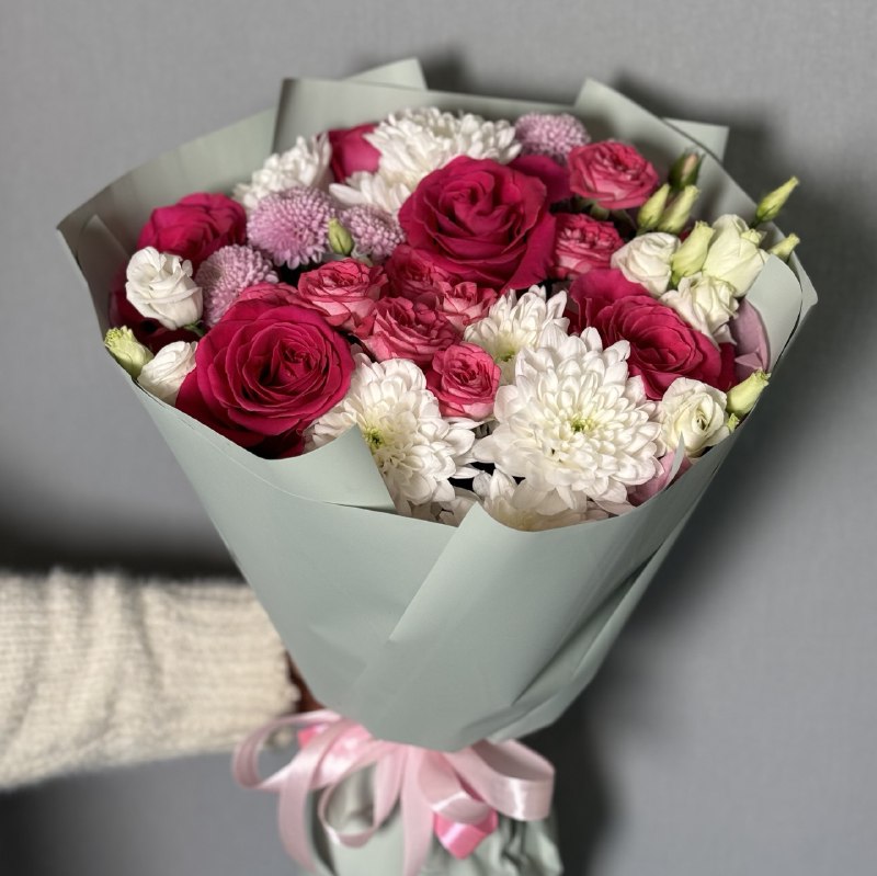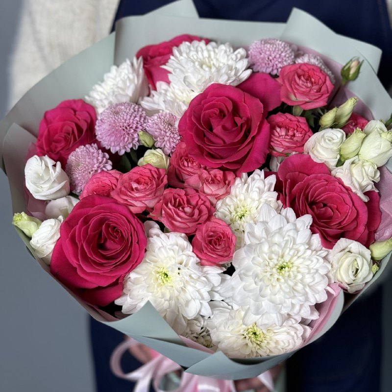 Букет микс с яркими и ароматными розами сорта Пинк Флоид, нежной эустомой и хризантемой. Состав букета: Роза кустовая 2шт, Хризантема кустовая 2шт, Хризантема Сантини 2шт, Эустома 2шт, Роза пинк флойд 5шт. Размеры букета: ширина 38см, высота 50см