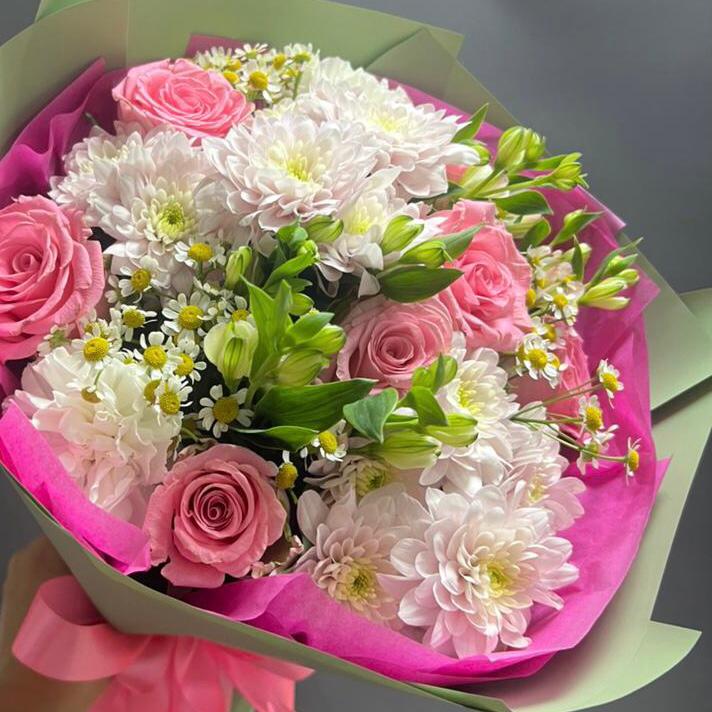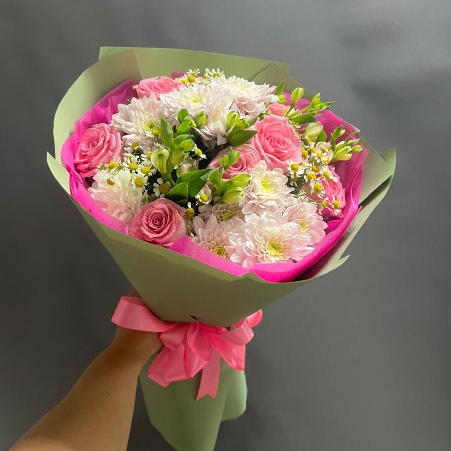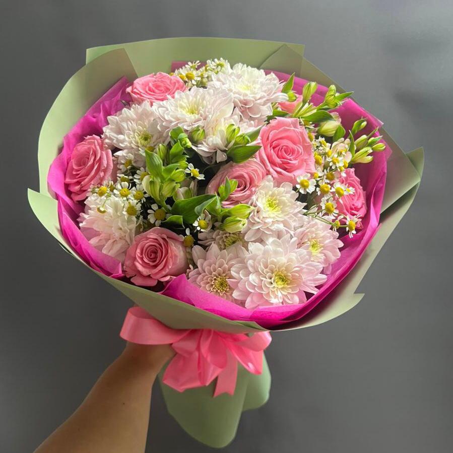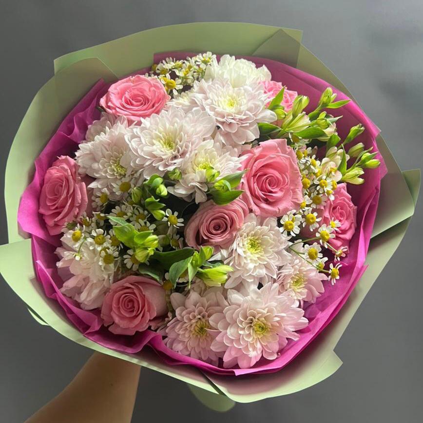 Состав букета - Альстромерия 2шт, танацетум 3шт, хризантема кустовая 2шт, диантус белый - 2, роза одноголовая -7шт и упаковка