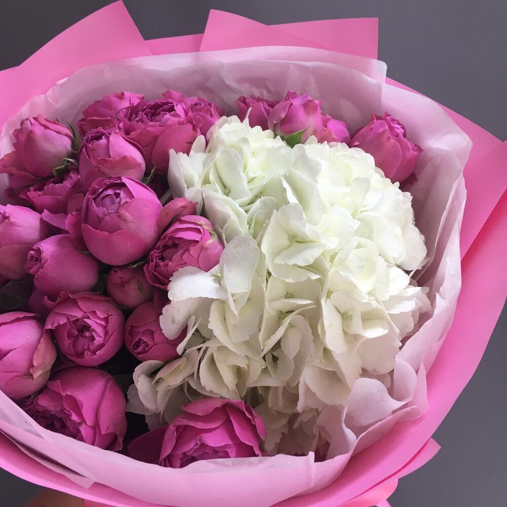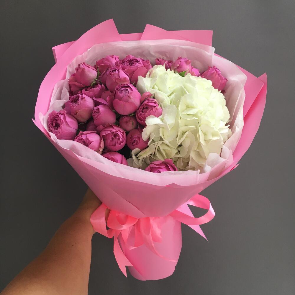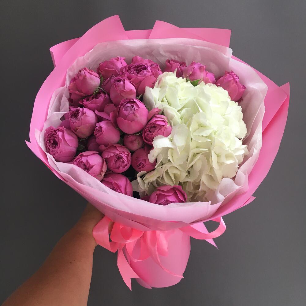 букет из кустовых пионовидных роз с белой гортензией заказать с доставкой