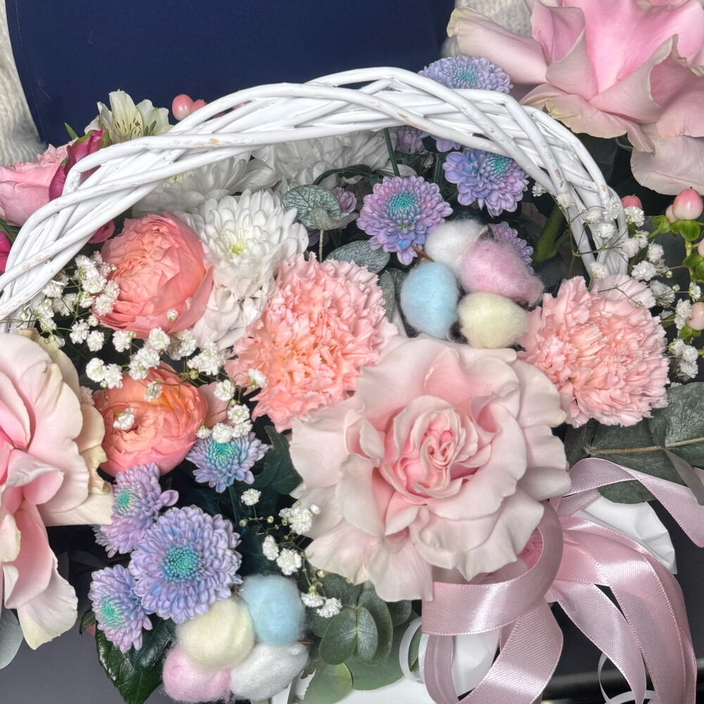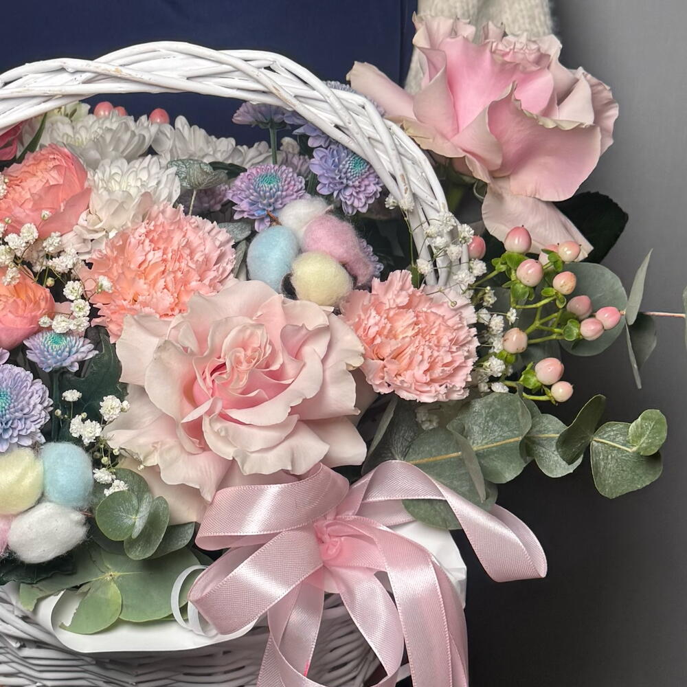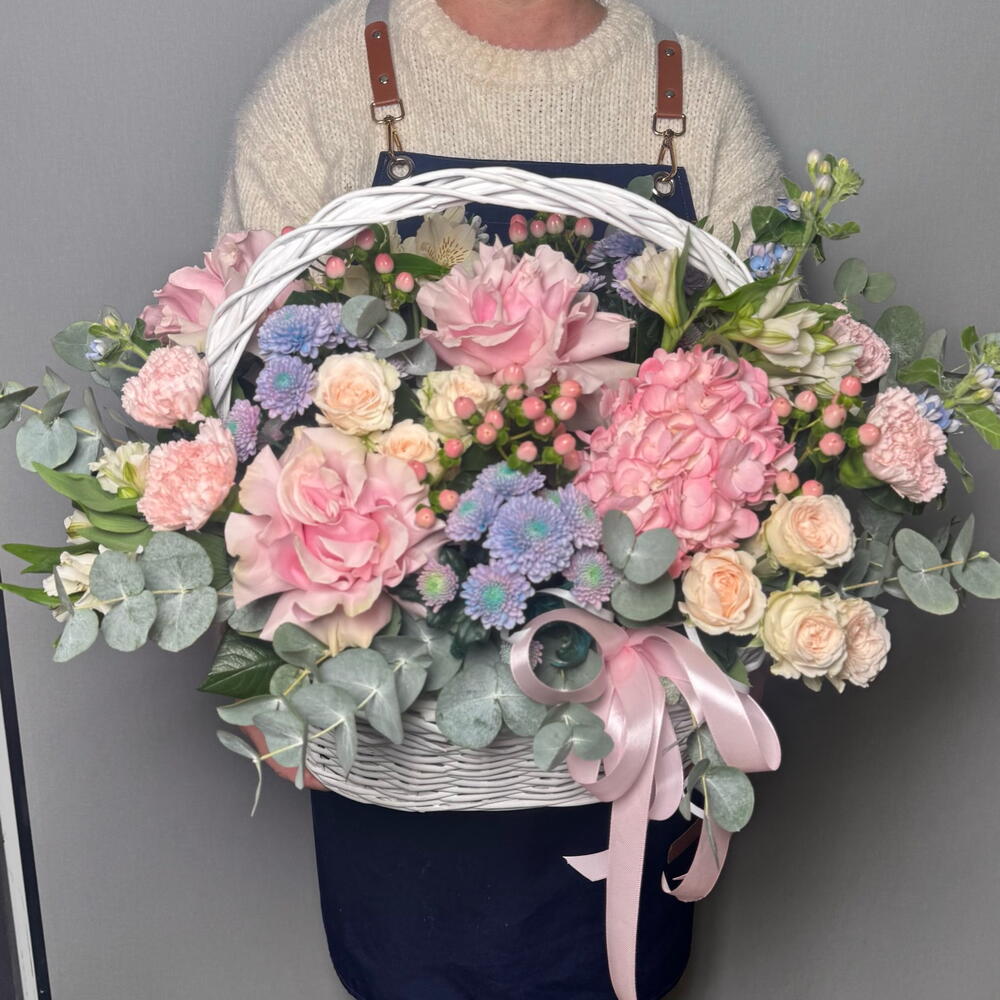 Состав Гиперикум - 4 шт. Оксипеталум - 4 шт. Гортензия розовая - 1 шт. Эвкалипт Синерия - 2 шт. Диантус розовый - 5 шт. Оазис флористический - 1 шт. пинк мондиаль - 3 шт. салинеро роза - 3 шт. корзина плетеная м - 1 шт. альстромерия белая - 4 шт. дасти мермайд - 3 шт.