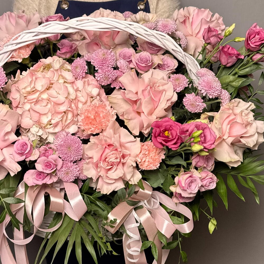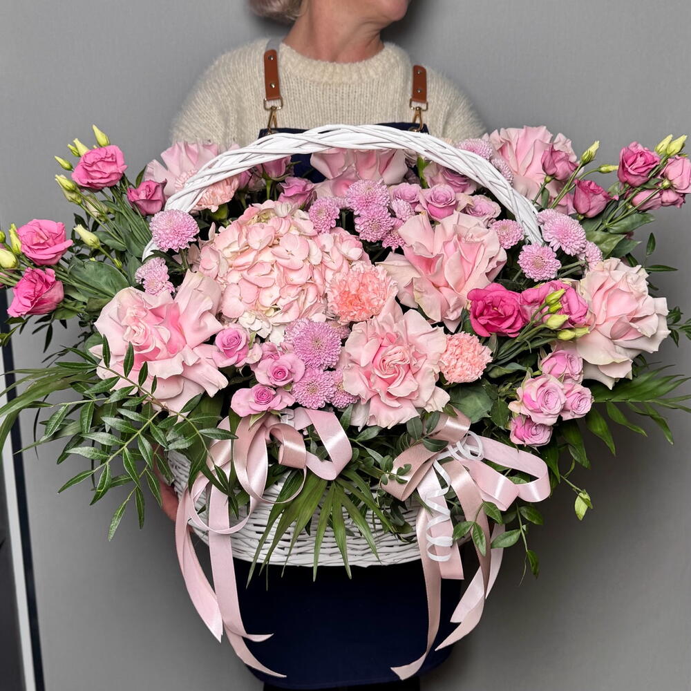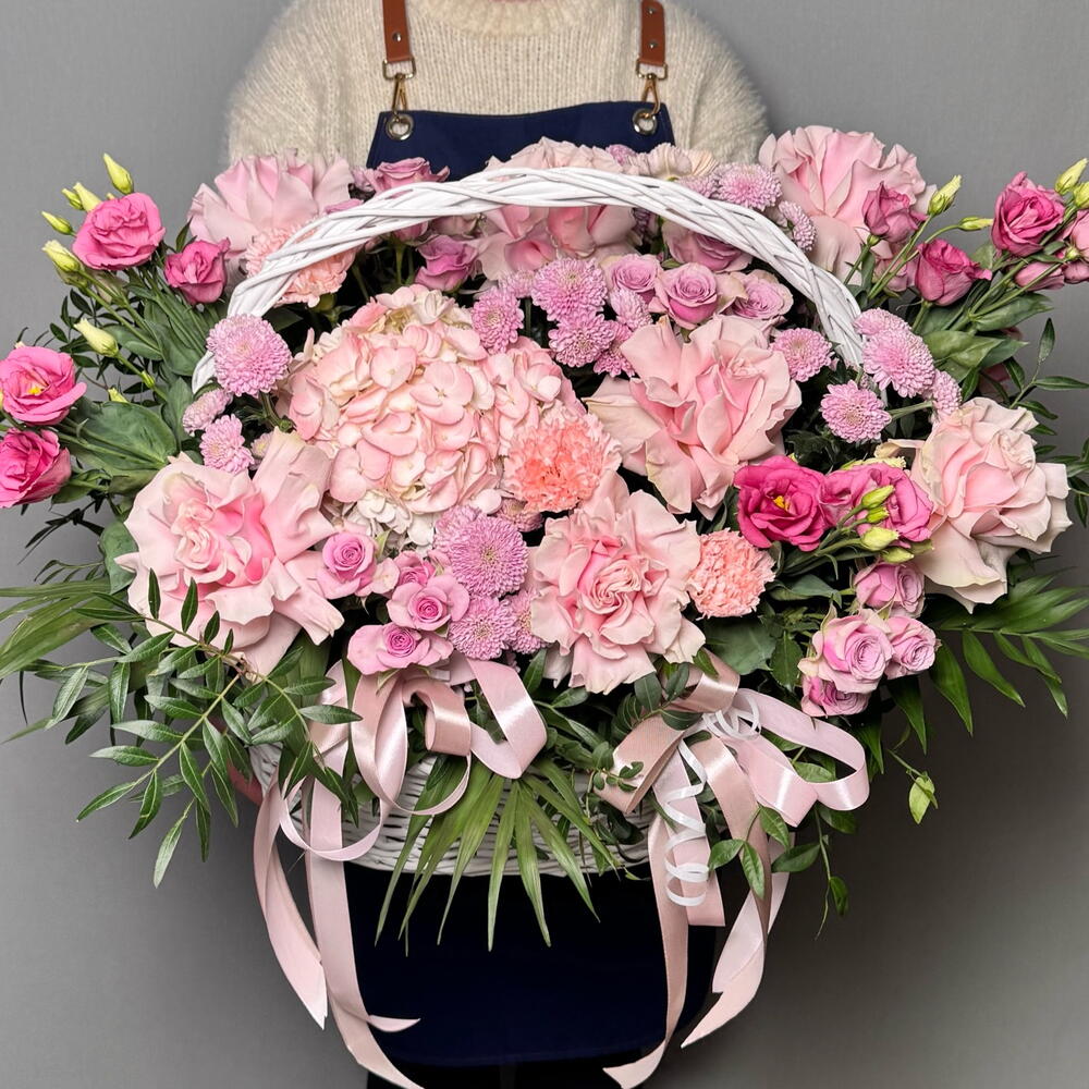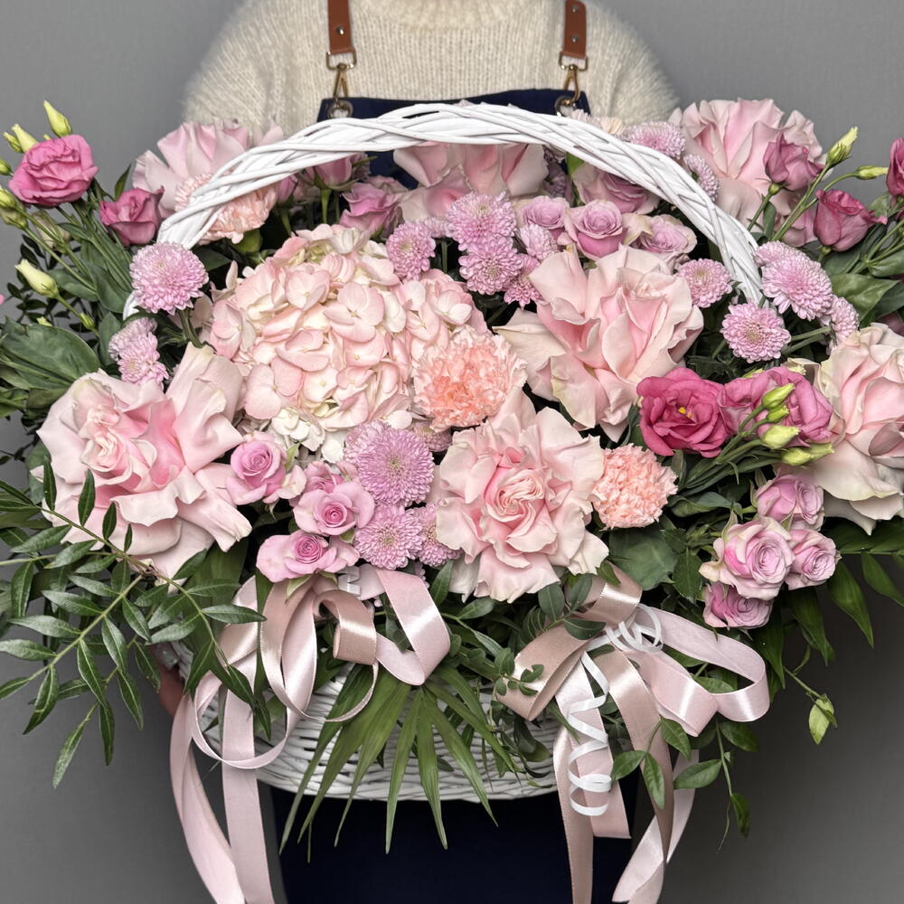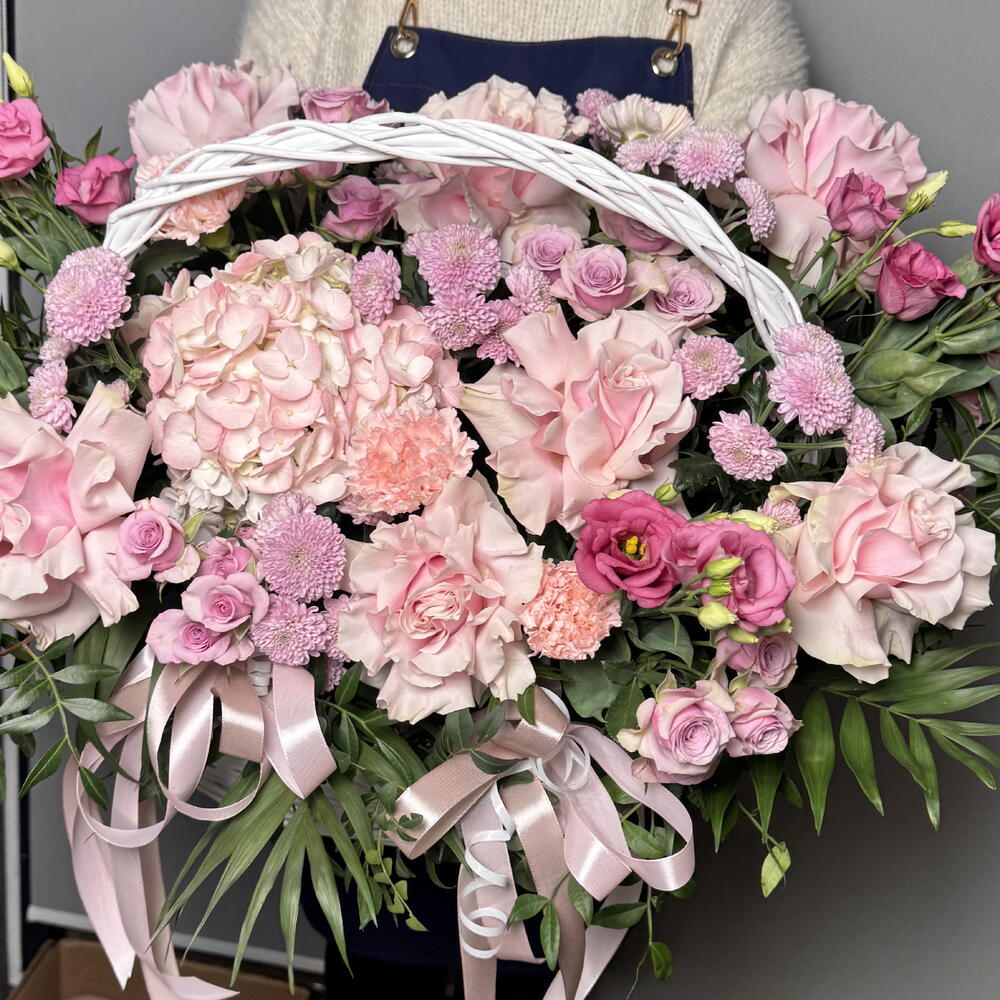Состав Писташ - 3 шт. эустома розовая - 3 шт. Гортензия розовая - 1 шт. Диантус розовый - 5 шт. Оазис флористический - 3 шт. пинк мондиаль - 7 шт. корзина плетеная l - 1 шт. Чико Типе - 6 шт. лейла кустовая роза - 5 шт. элисон свит хризантема - 8 шт.