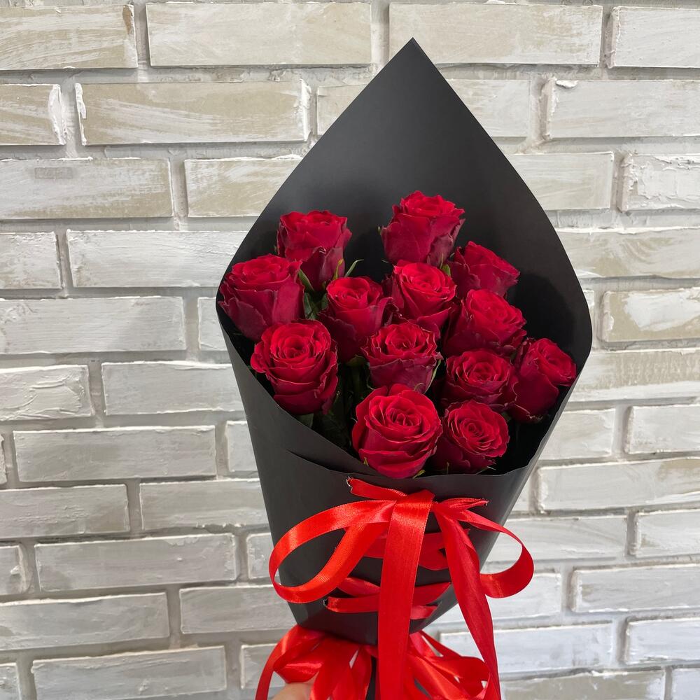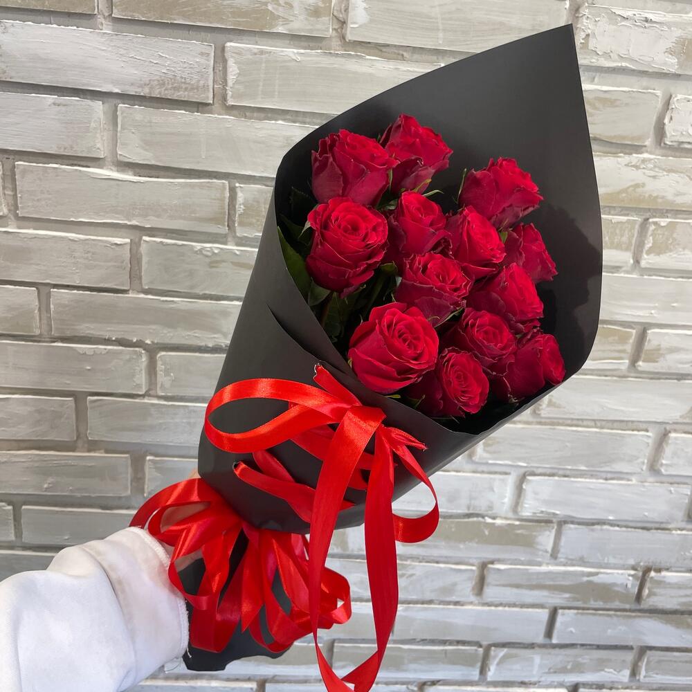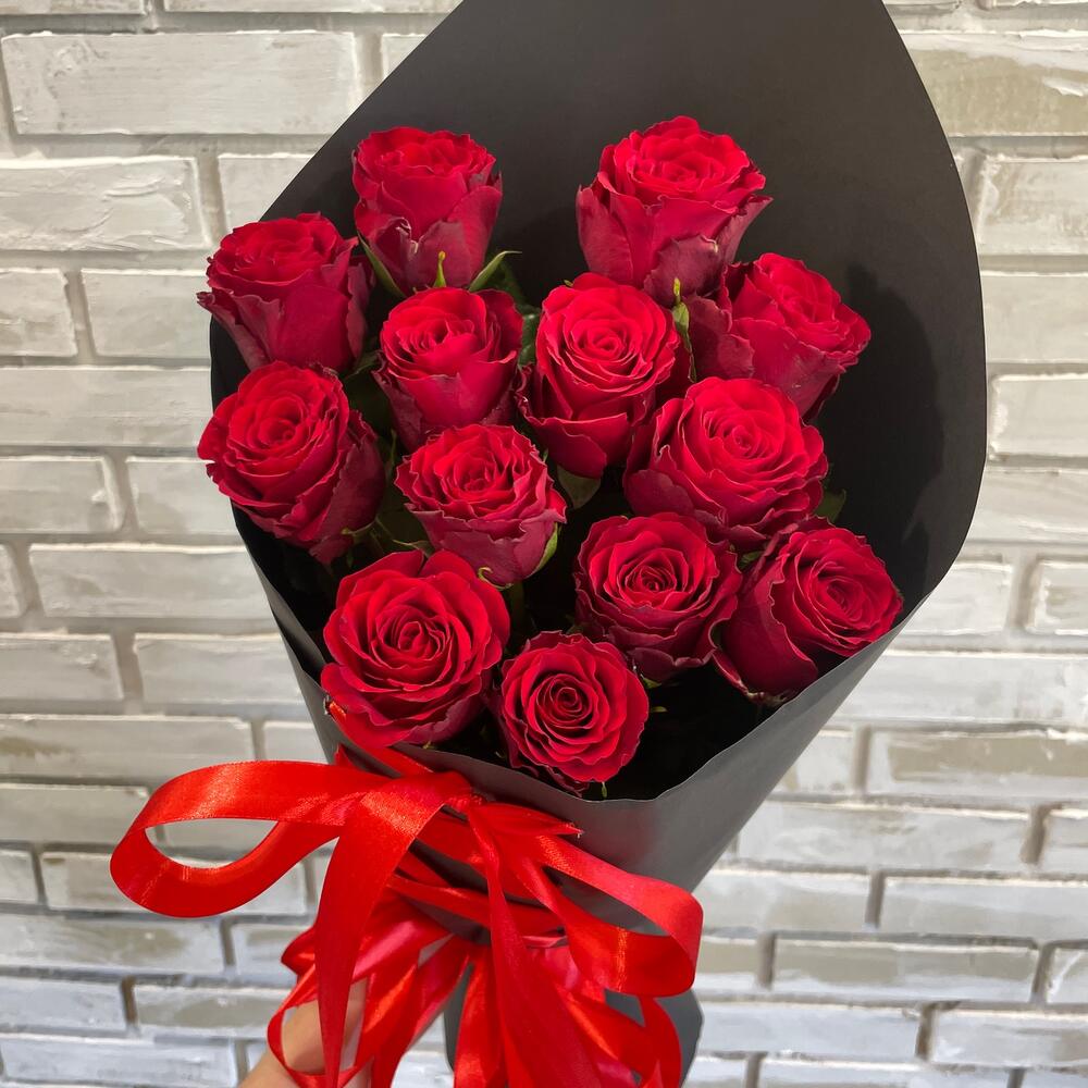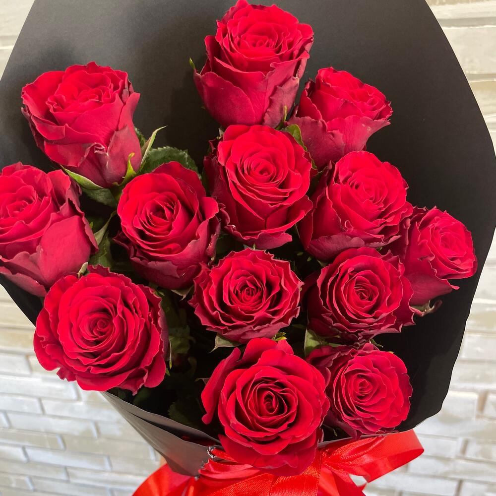 Букет красных роз в стильной черной упаковке. В букете 13 красных роз, ширина букета 30см, высота 15см.