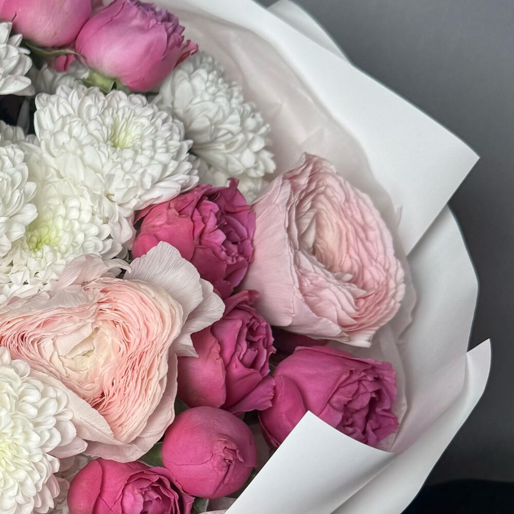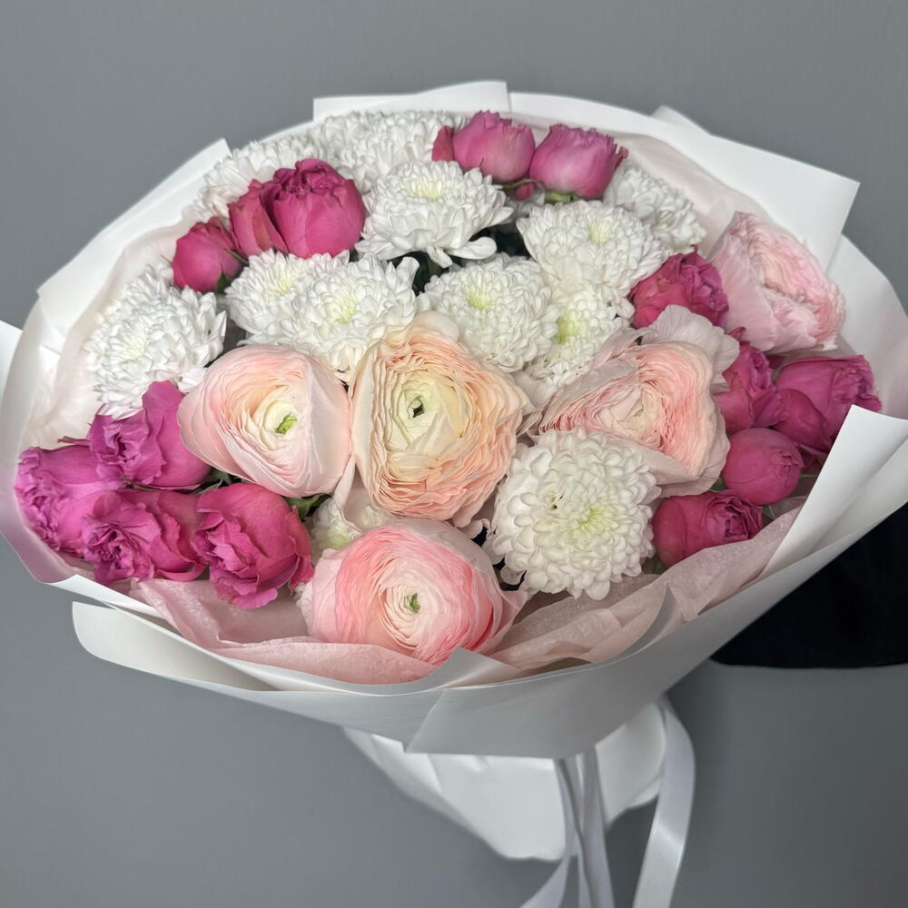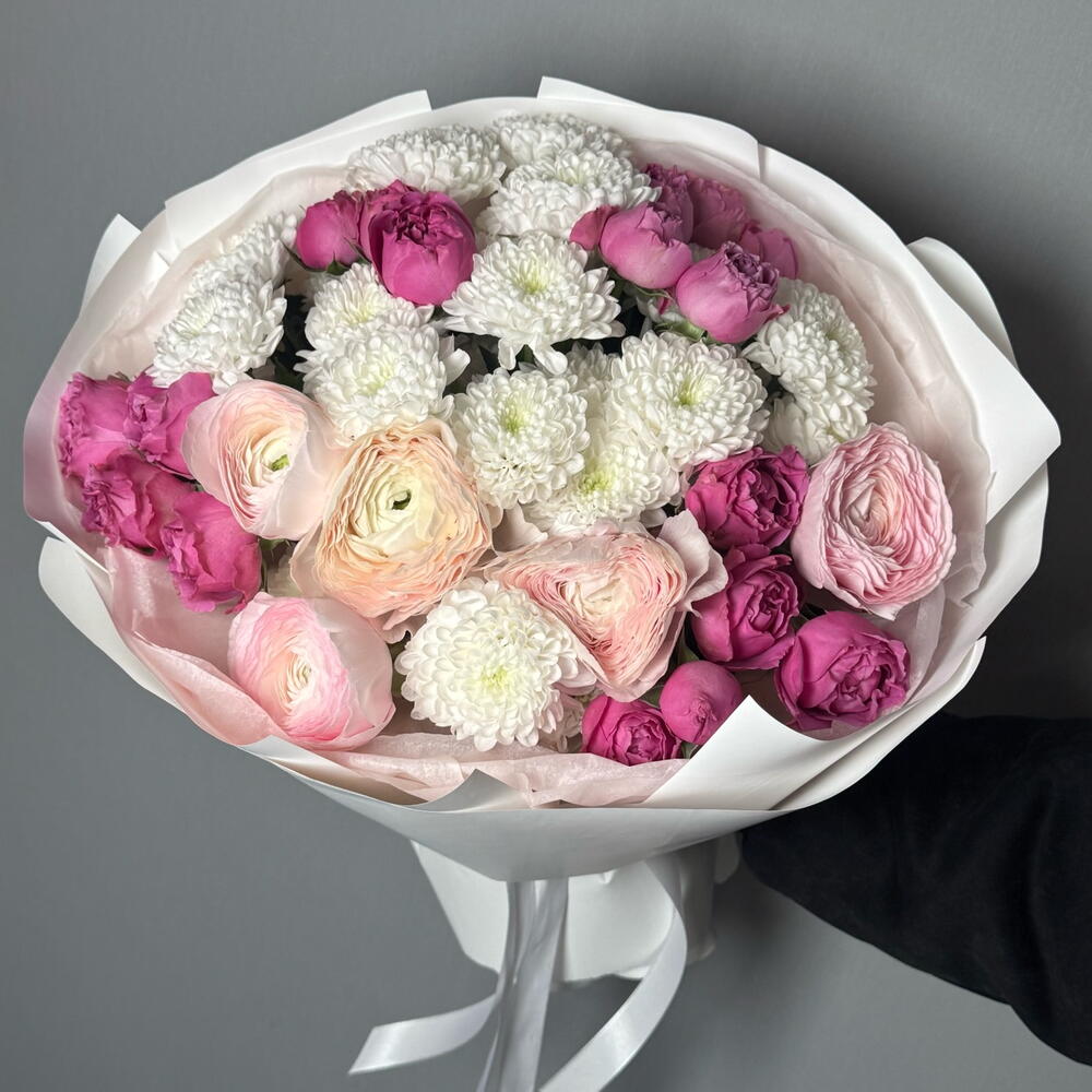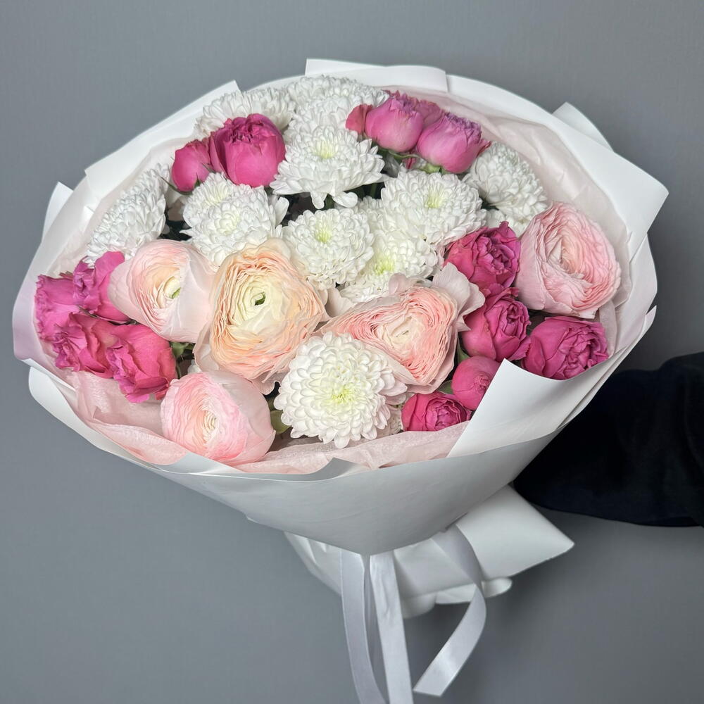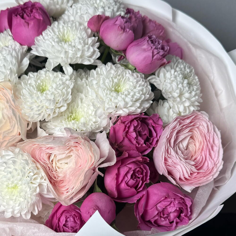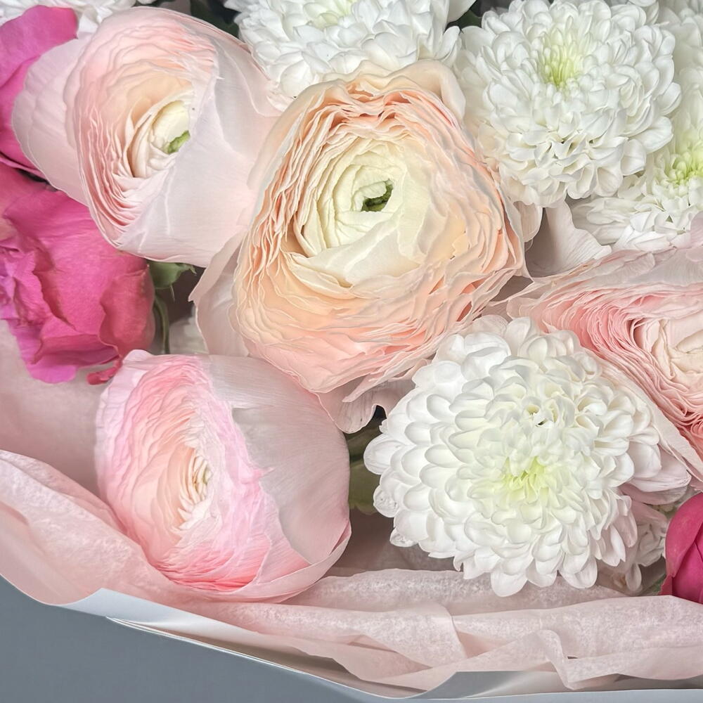 Нежный букет с пионовидными розами и ранюнкулюсами