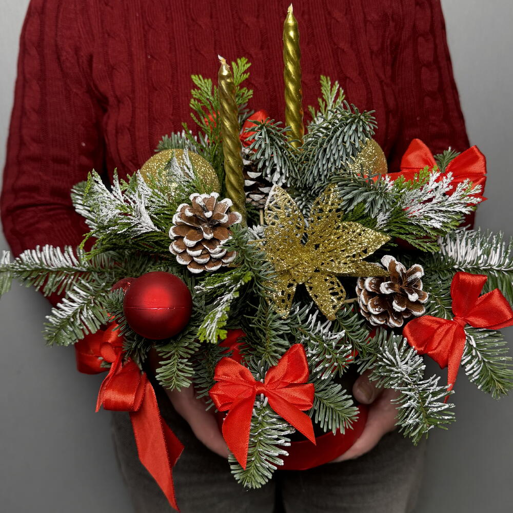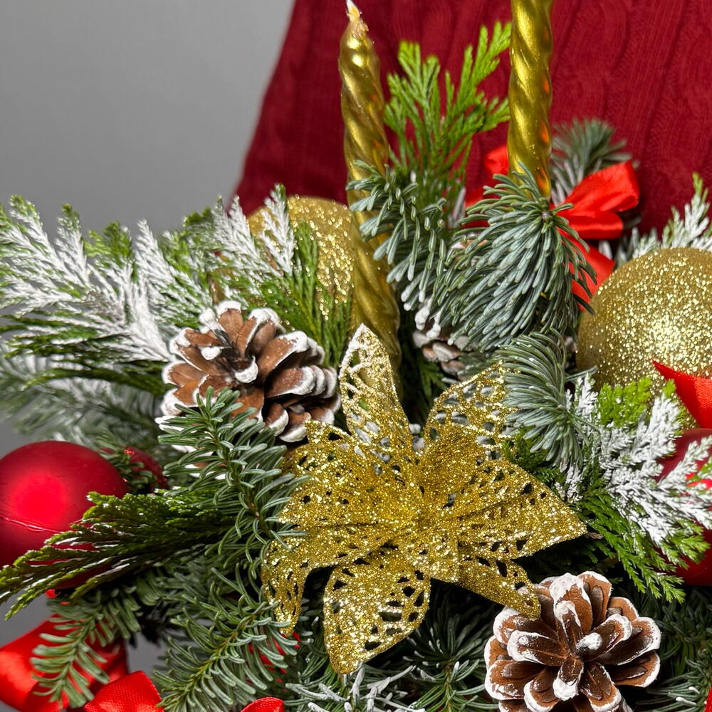 Состав Нобилис - 1 шт. Свеча новогодняя - 2 шт. Оазис флористический - 1 шт. декор новогодний в ассортименте - 9 шт. мини новогодняя коробка - 1 шт.