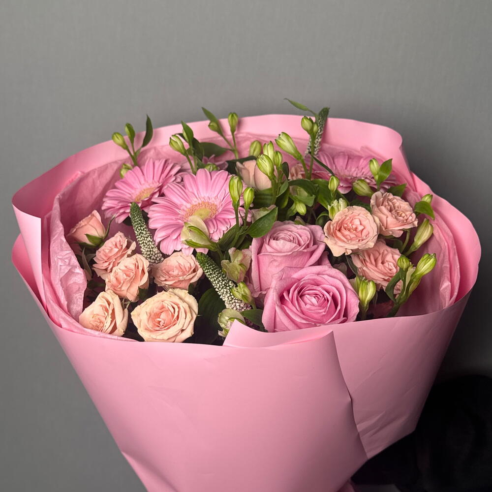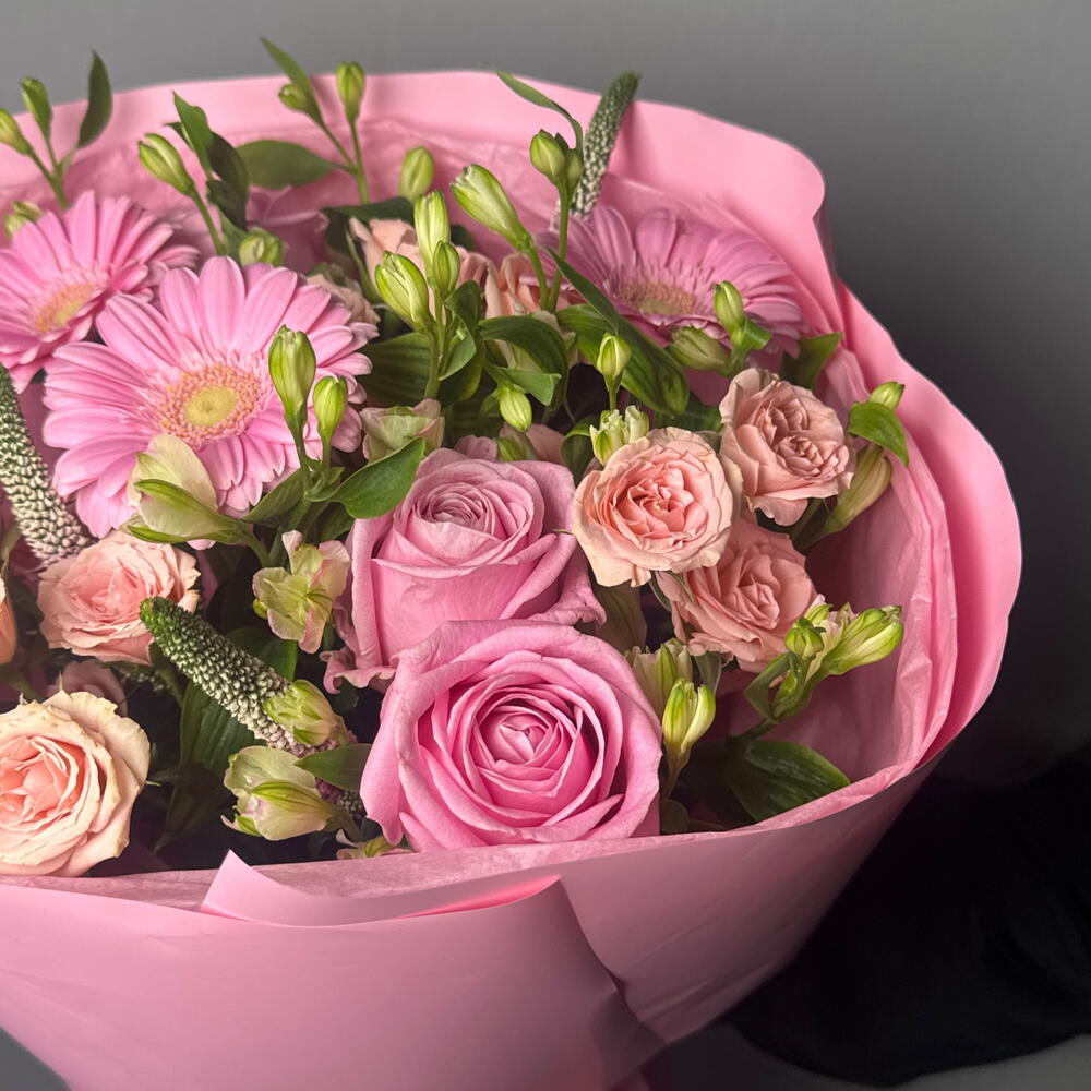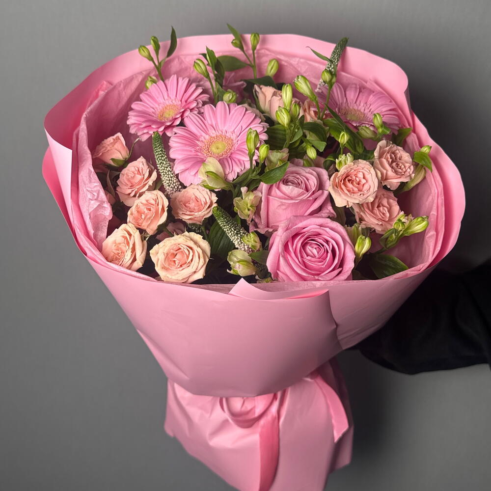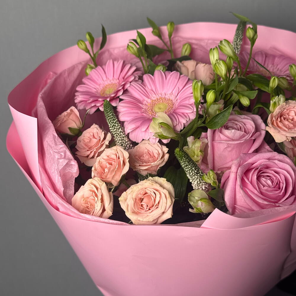 Состав Альстромерия - 3 шт. Вероника - 3 шт. Кустовая роза - 4 шт. Гербера - 3 шт. роза седуктив - 3 шт.
