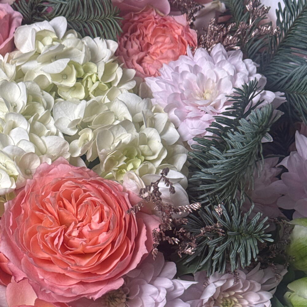 Состав Гортензия белая - 1 шт. Нобилис - 1 шт. джульетта роза пионовидная - 2 шт. пинк мондиаль - 3 шт. пастелла хризантема - 2 шт. Лимониум Краш. Пепл - 1 шт. альстромерия белая - 2 шт.