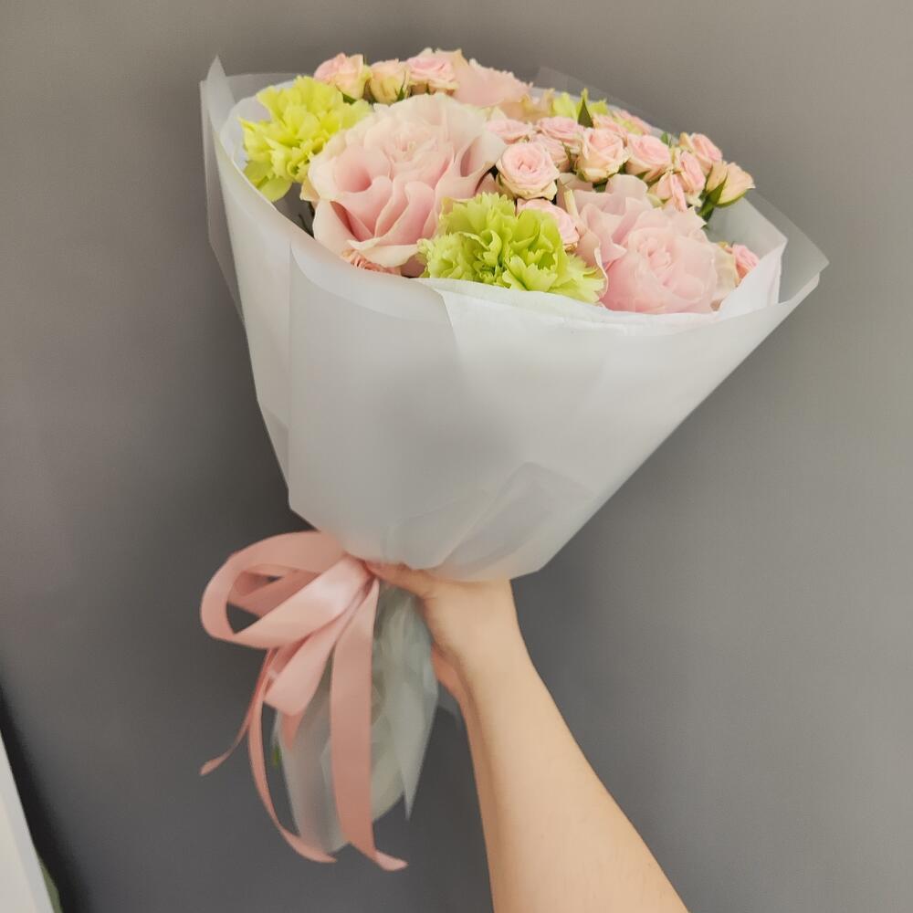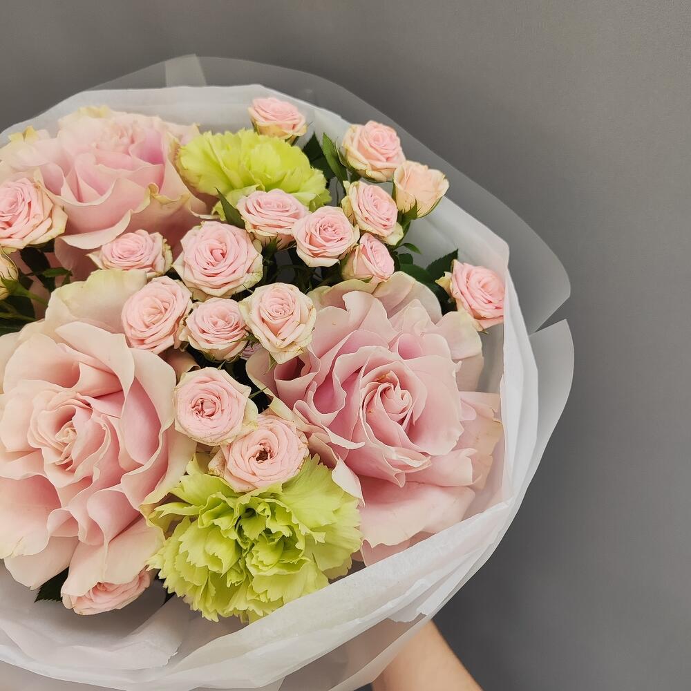 Роза кустовая - 3 шт, Французская роза - 3 шт. Диантус зеленый - 3 в упаковке