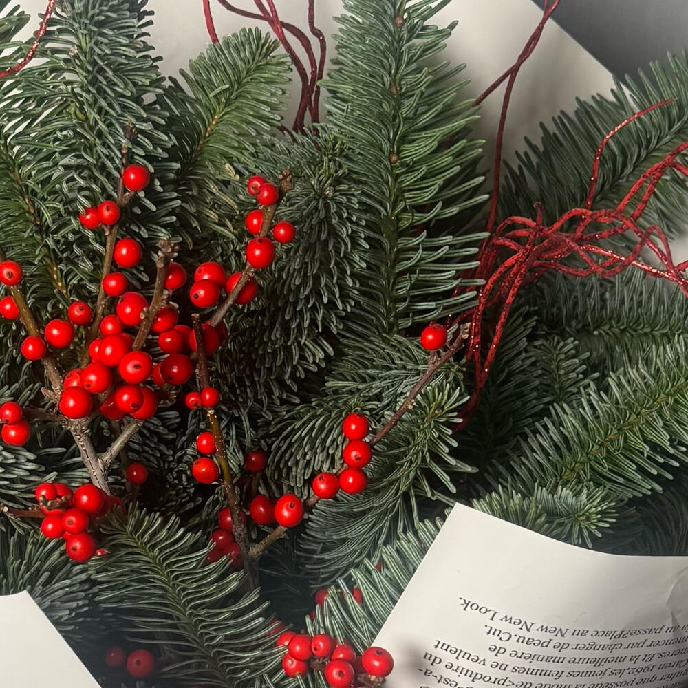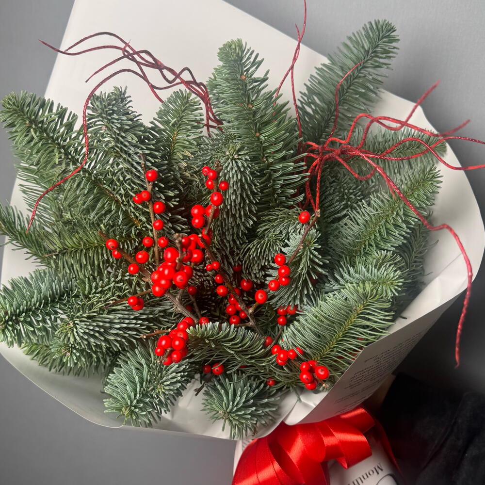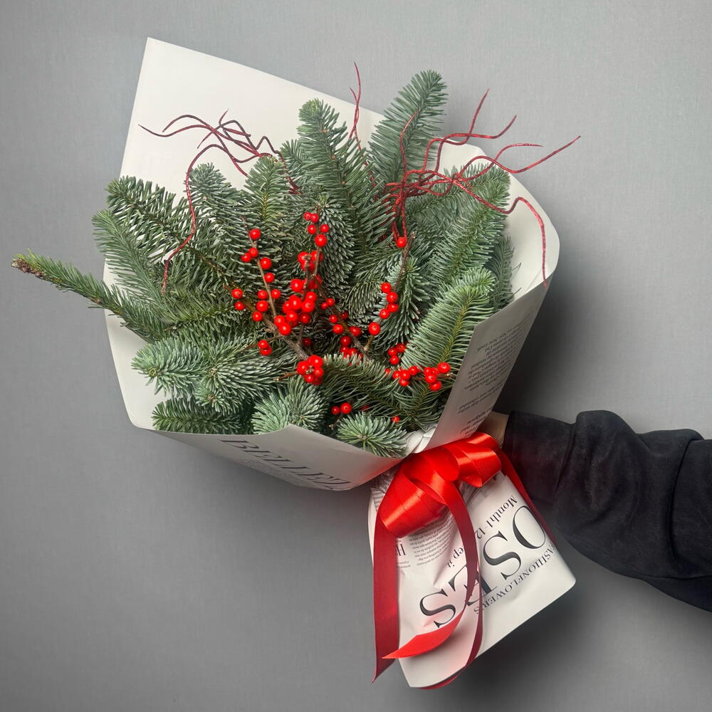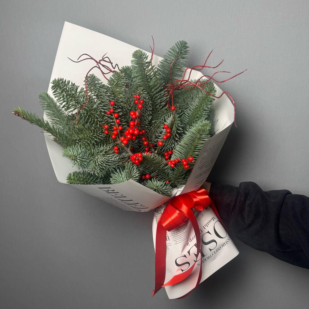 Состав Илекс Красный - 1 шт. Нобилис - 1 шт. Оформление матовая пленка - 1 шт. декоративные ветки - 2 шт.